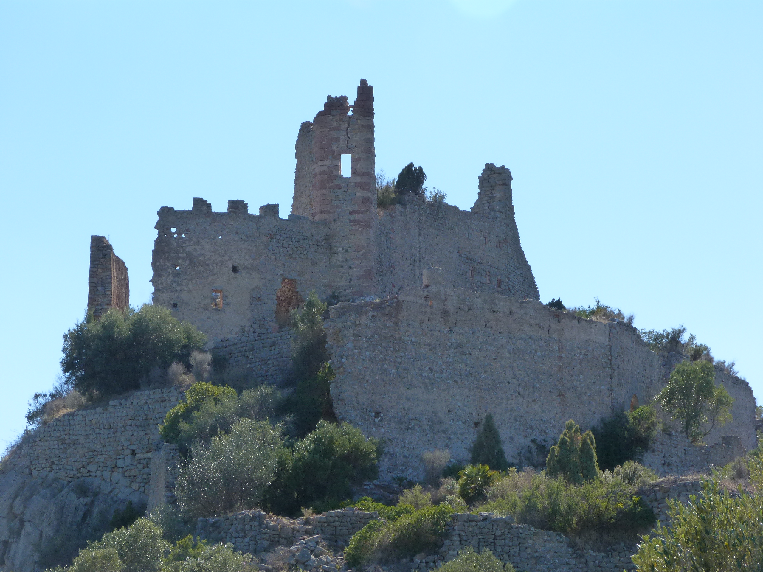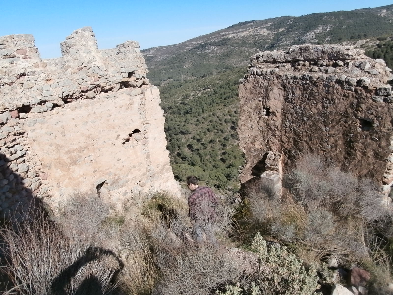La cruzamos y trás la primera curva vemos a mano derecha un camino en el que aparcamos y donde siguiendo la senda comenzamos la dura ascensión al Castillo por la ladera accesible del monte donde esta ubicado. El sendero esta marcado por pequeños mojones con piedras, ya que es muy fácil perderse. La senda gana altura con rapidez, ya que es bastante empinada, pero no es demasiado larga. La misma se puede seguir bastante bien, hay alguna bifurcación pero son variantes de la misma senda. Pronto la subida se hace mas suave, llegamos a los restos de un muro, pero para nuestra sorpresa no hemos llegado todavía al Castillo, se trata de los restos del muro exterior o primera linea de muralla. Continuamos la senda, ahora gira hacía al derecha, pronto veremos frente a nosotros el Castillo, antes pasaremos por las ruinas de las casas que se encontraban dentro de los muros. La senda se hace mas marcada y llegamos al Castillo.