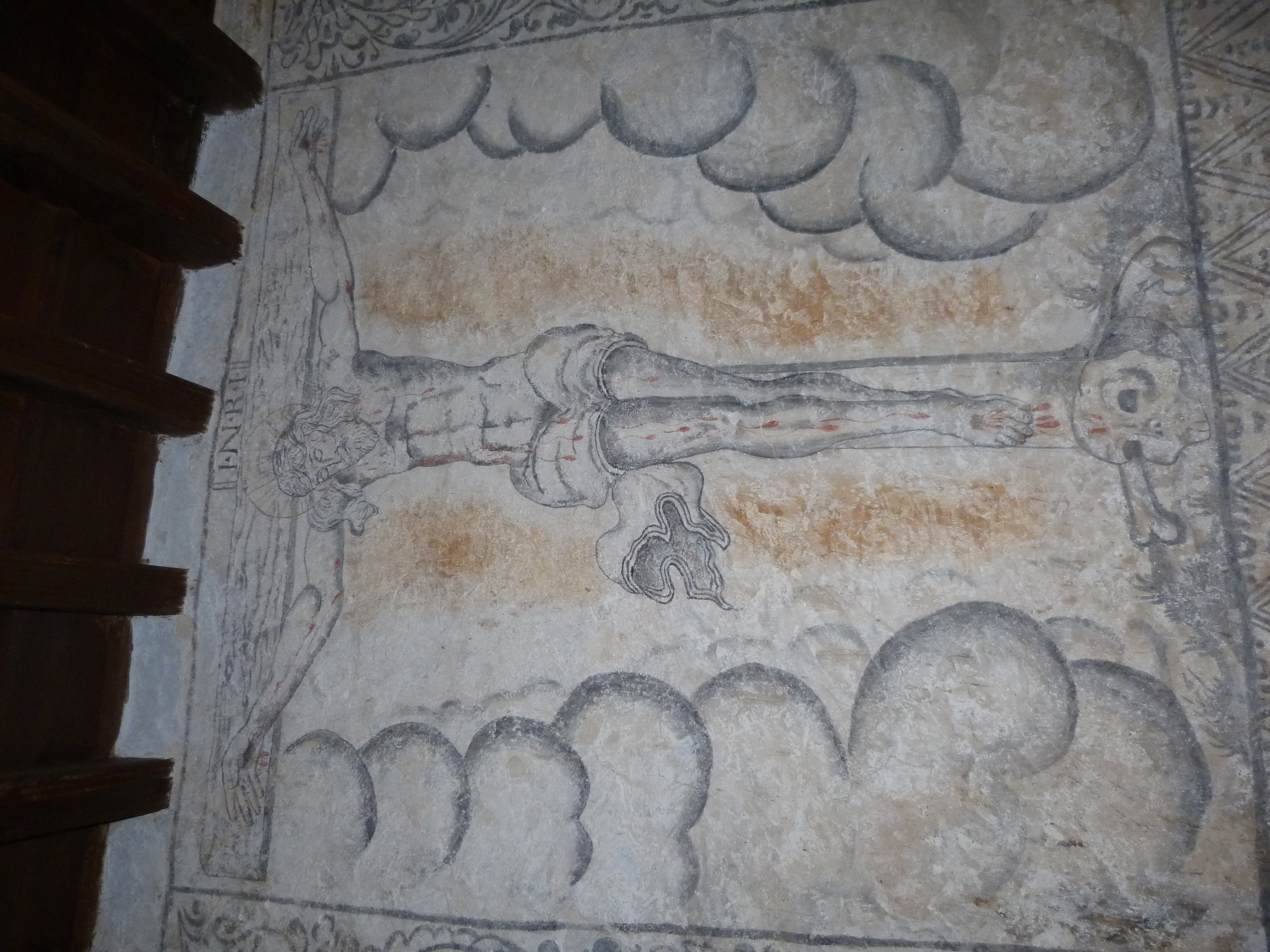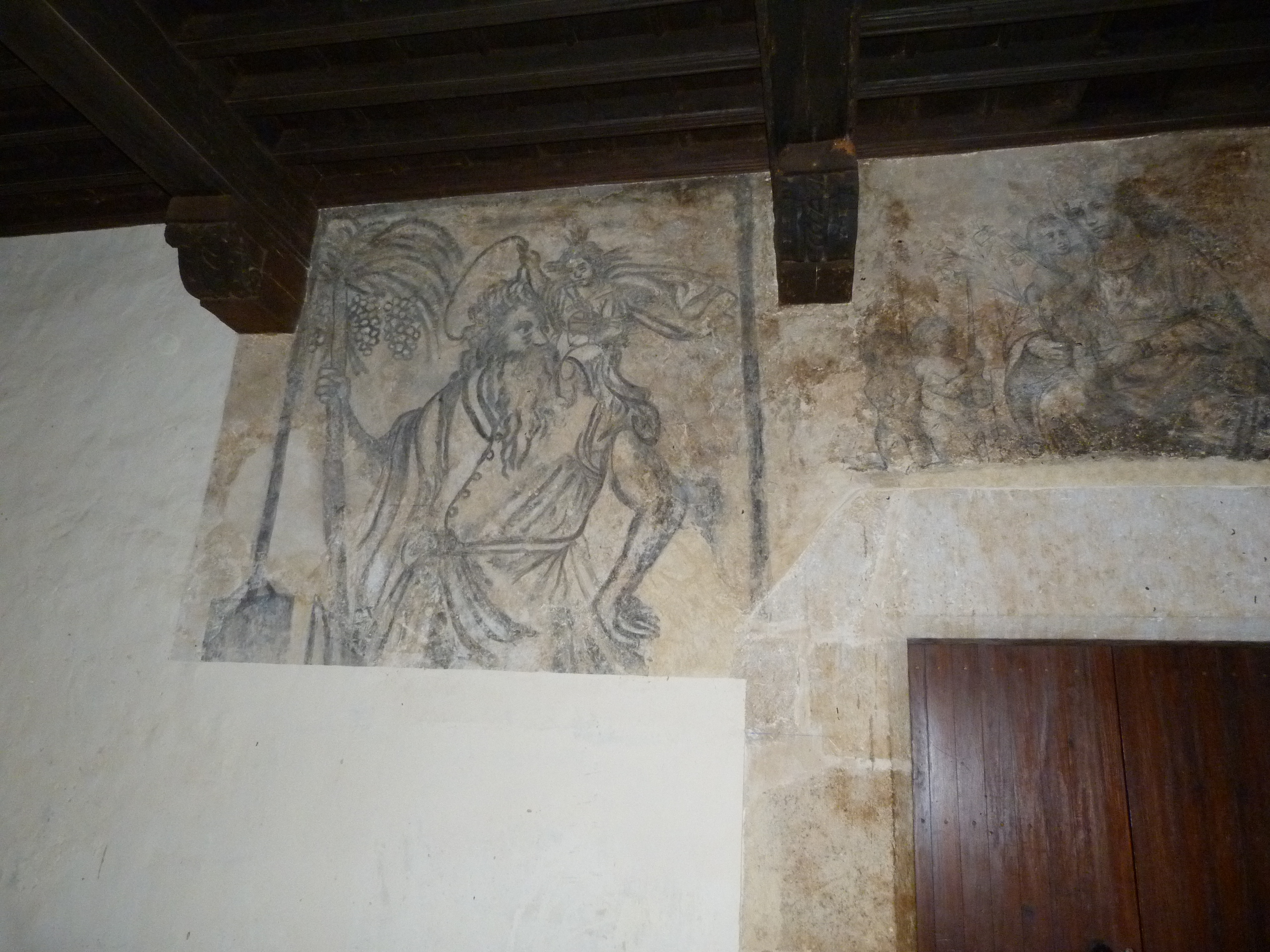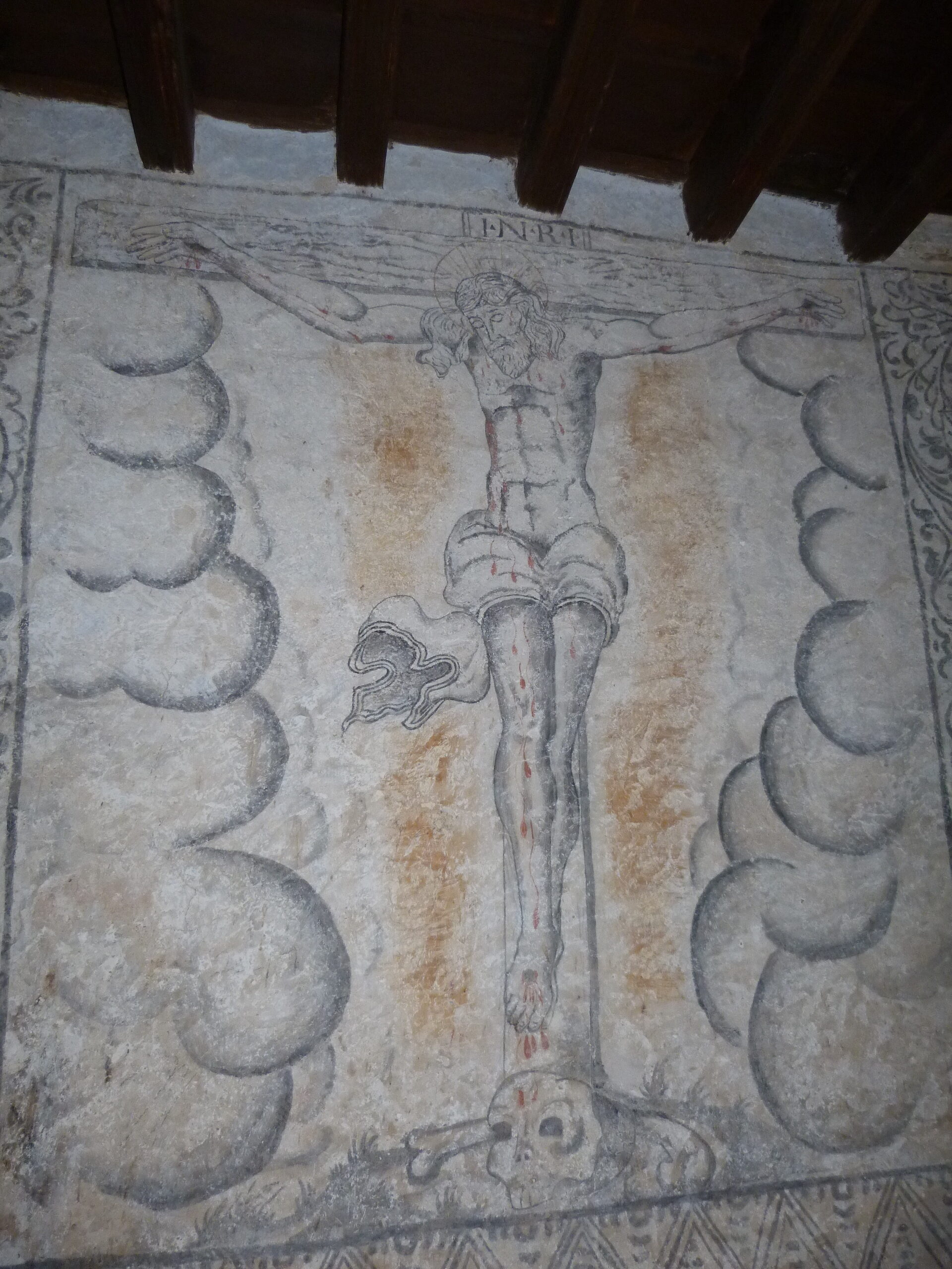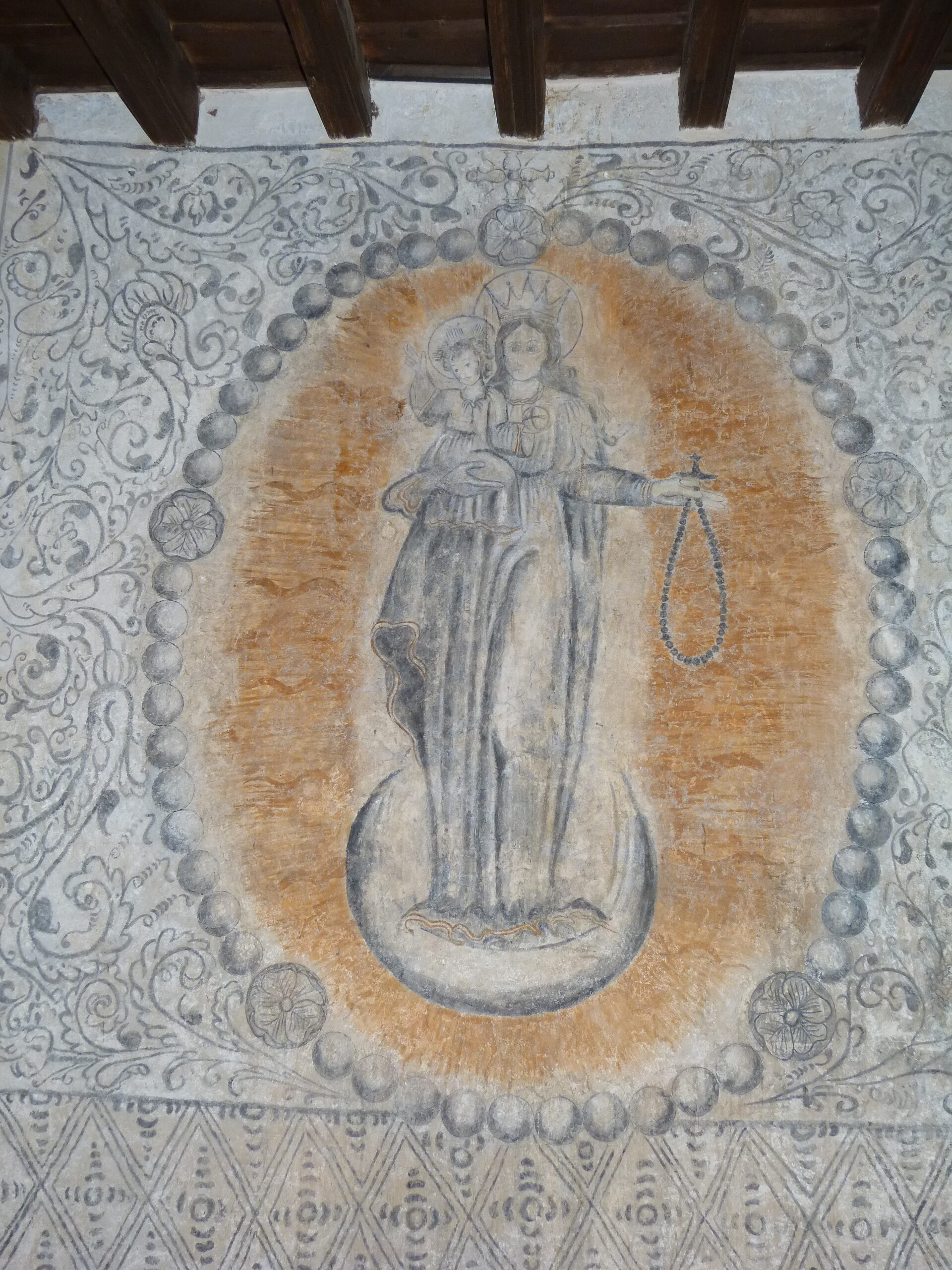 Se encuentran de forma aislada un Santo Cristo en la pared derecha y en la opuesta la Virgen del Rosario. Estas pinturas permanecieron encaladas de 1936 a 1955-56.