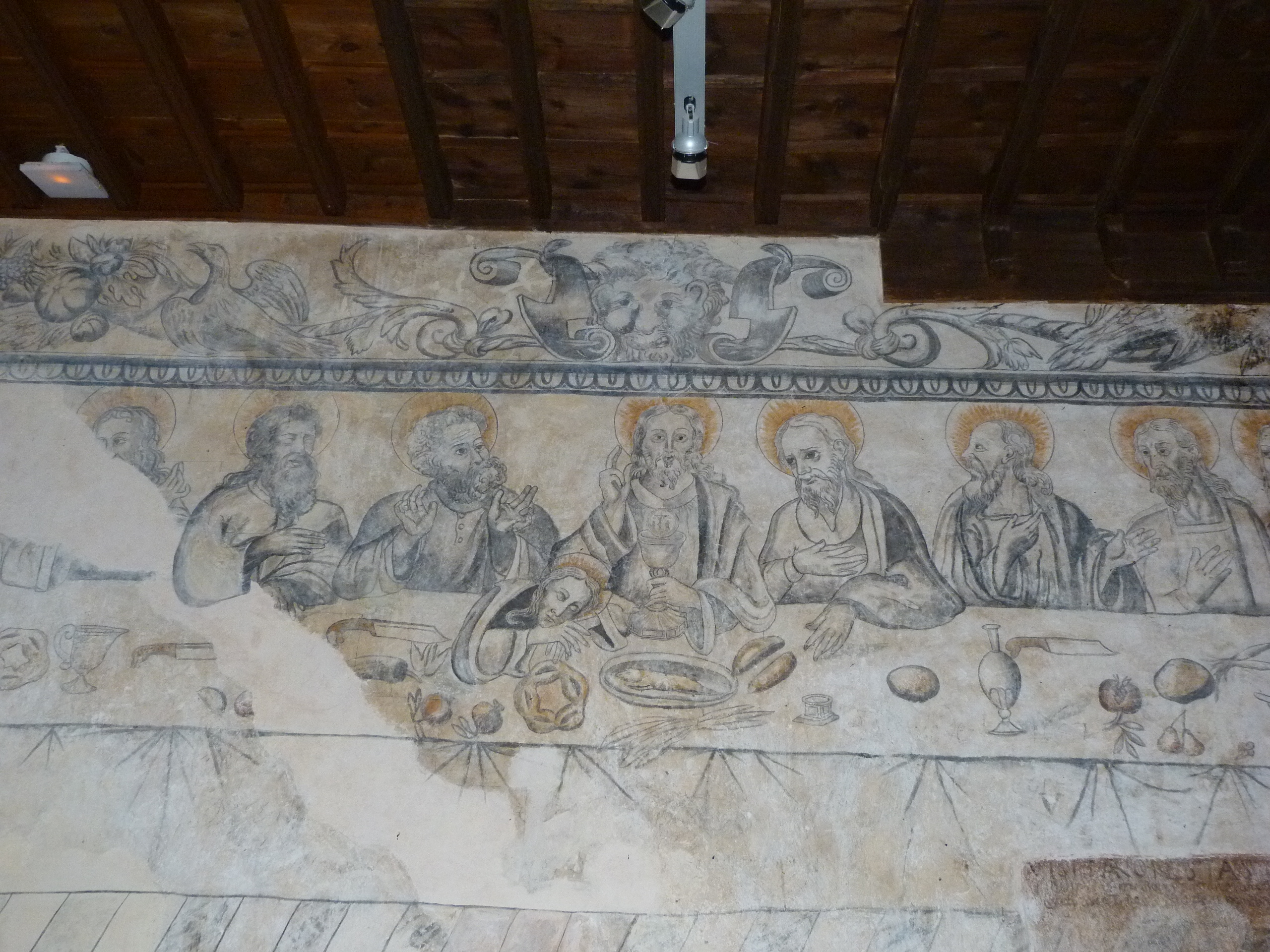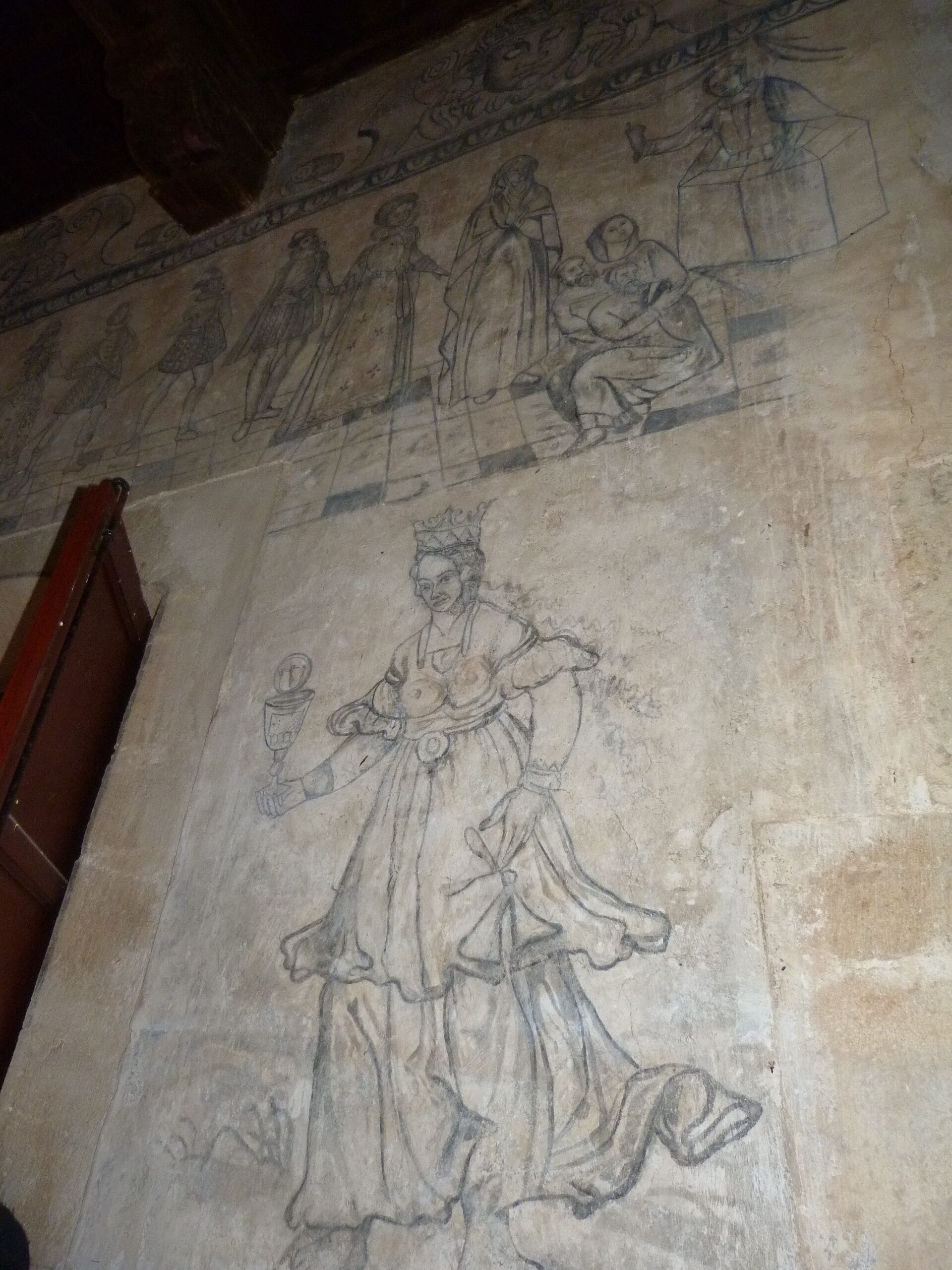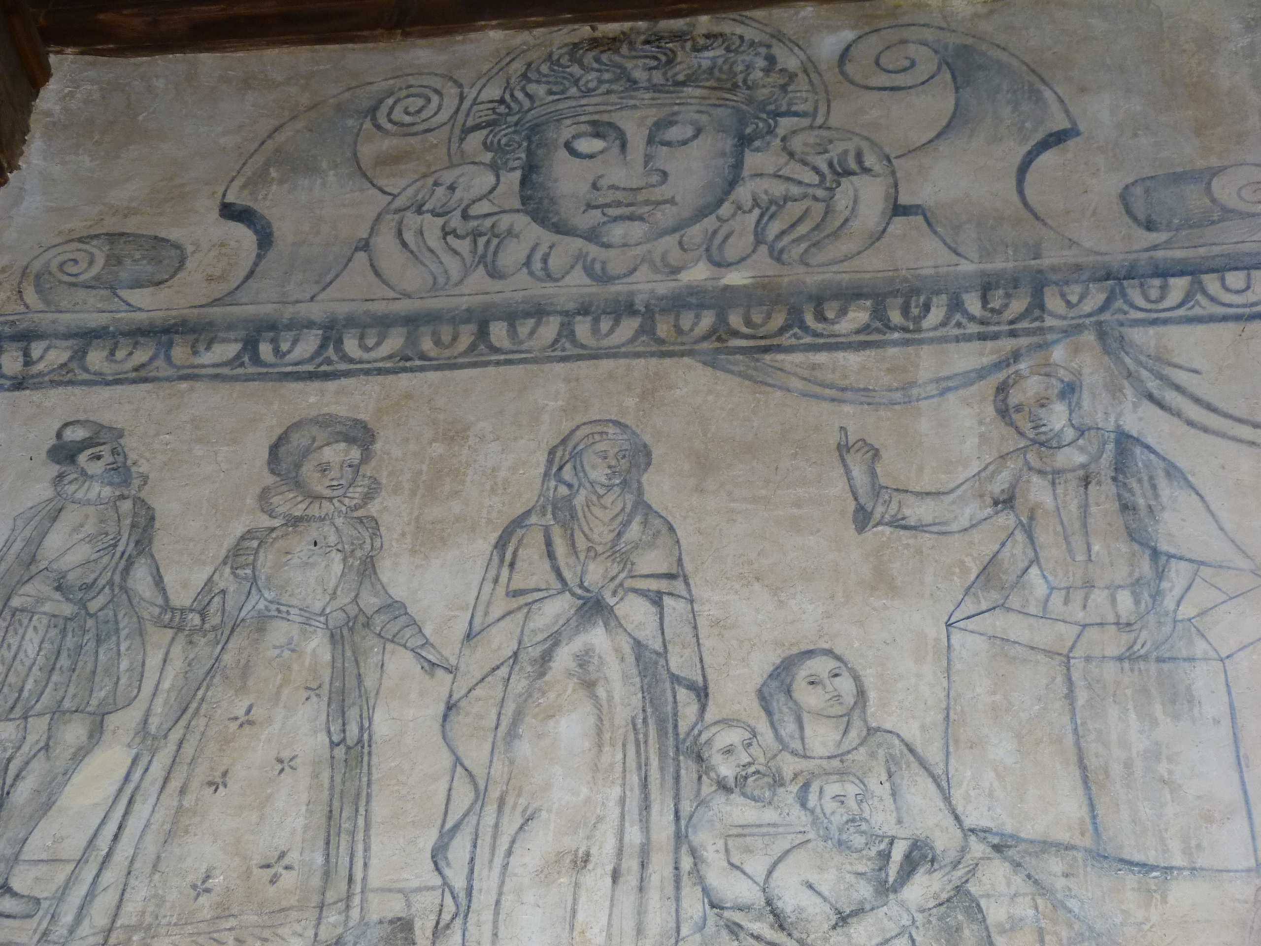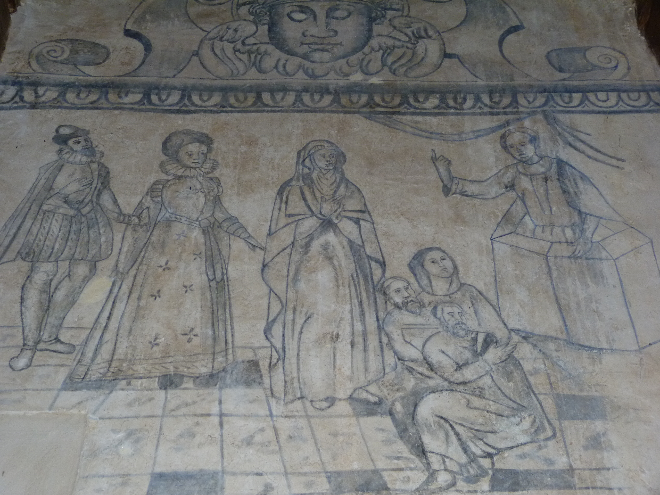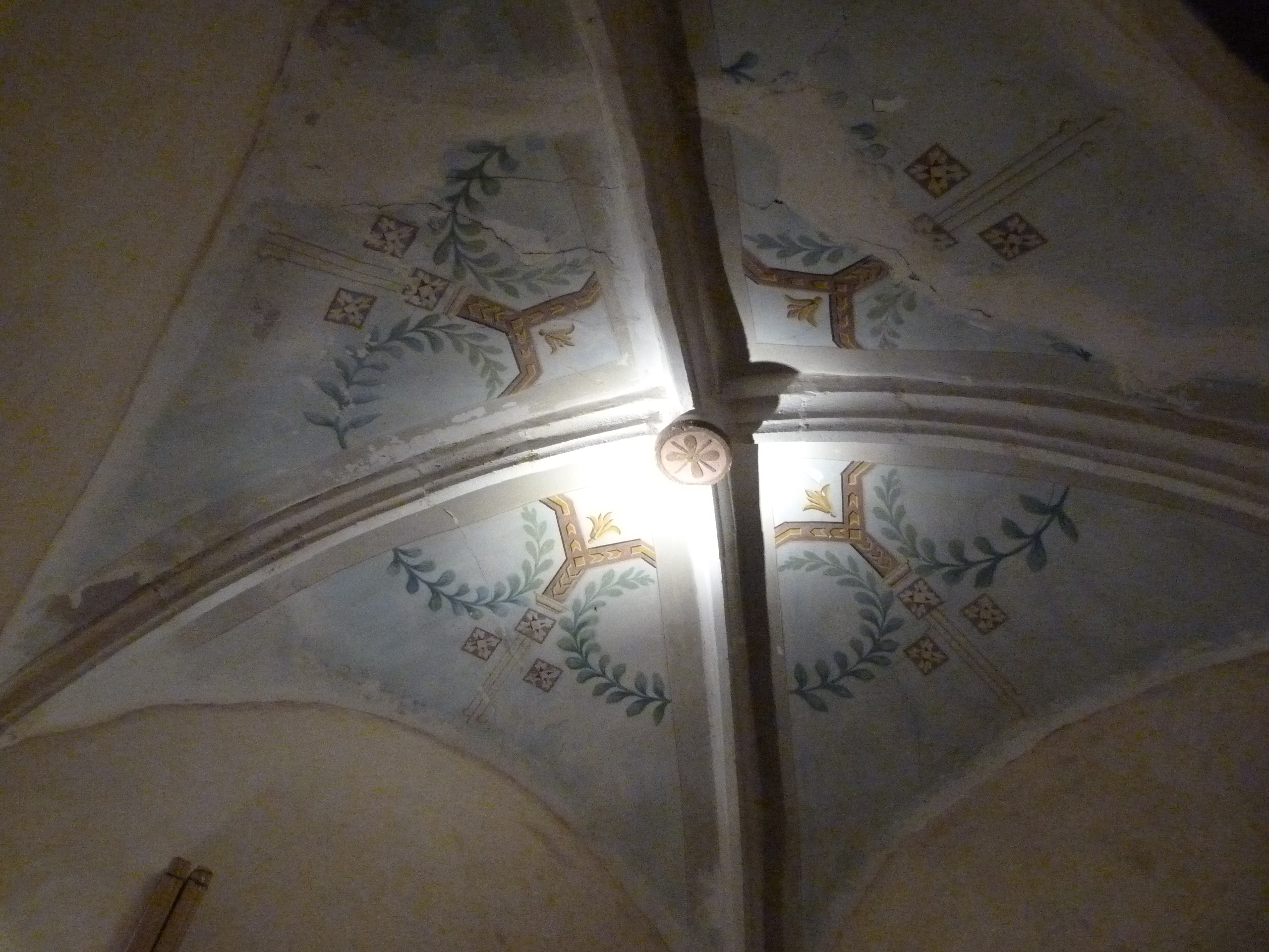 Se encuentran de forma aislada un Santo Cristo en la pared derecha y en la opuesta la Virgen del Rosario. Estas pinturas permanecieron encaladas de 1936 a 1955-56.