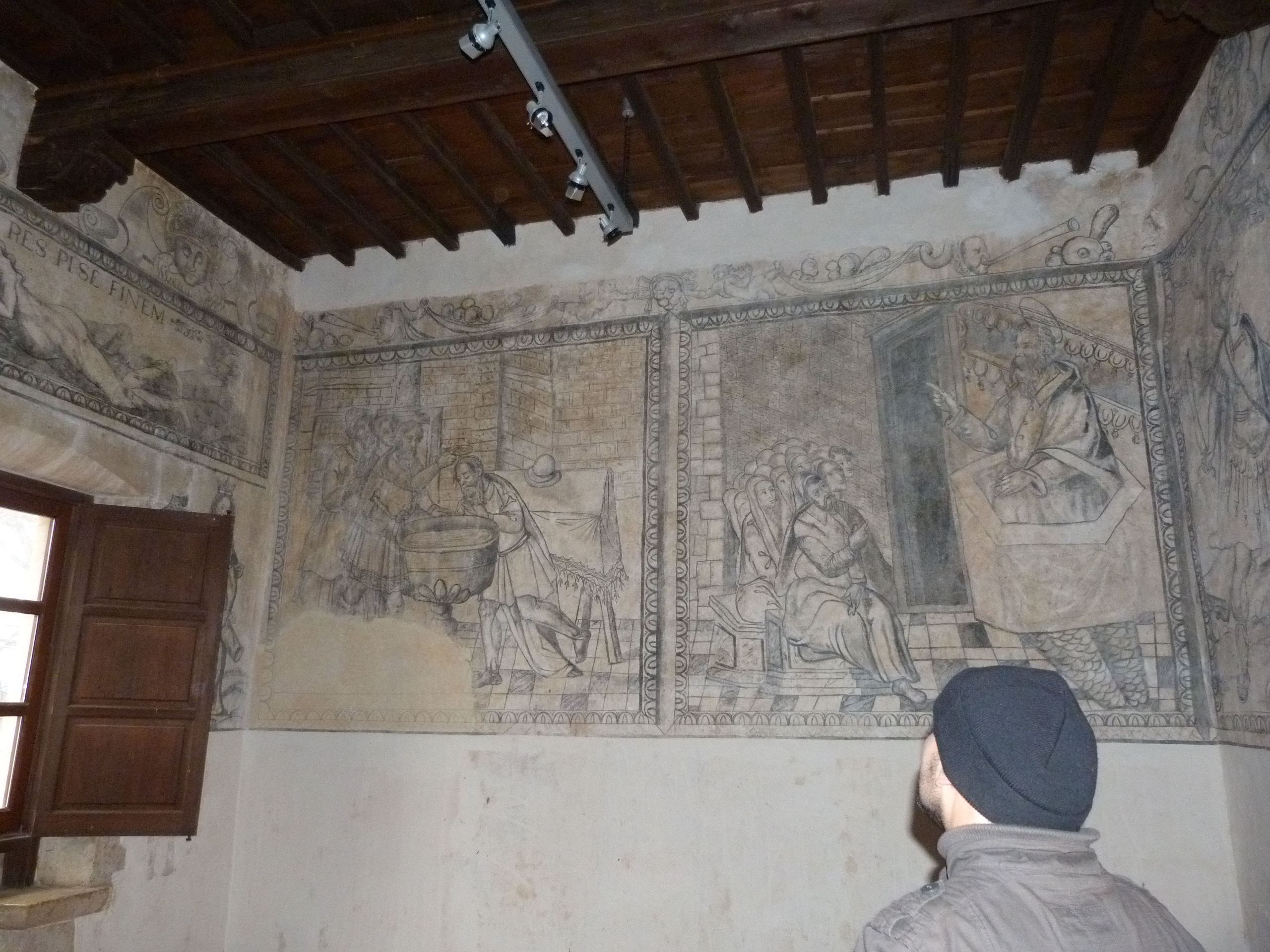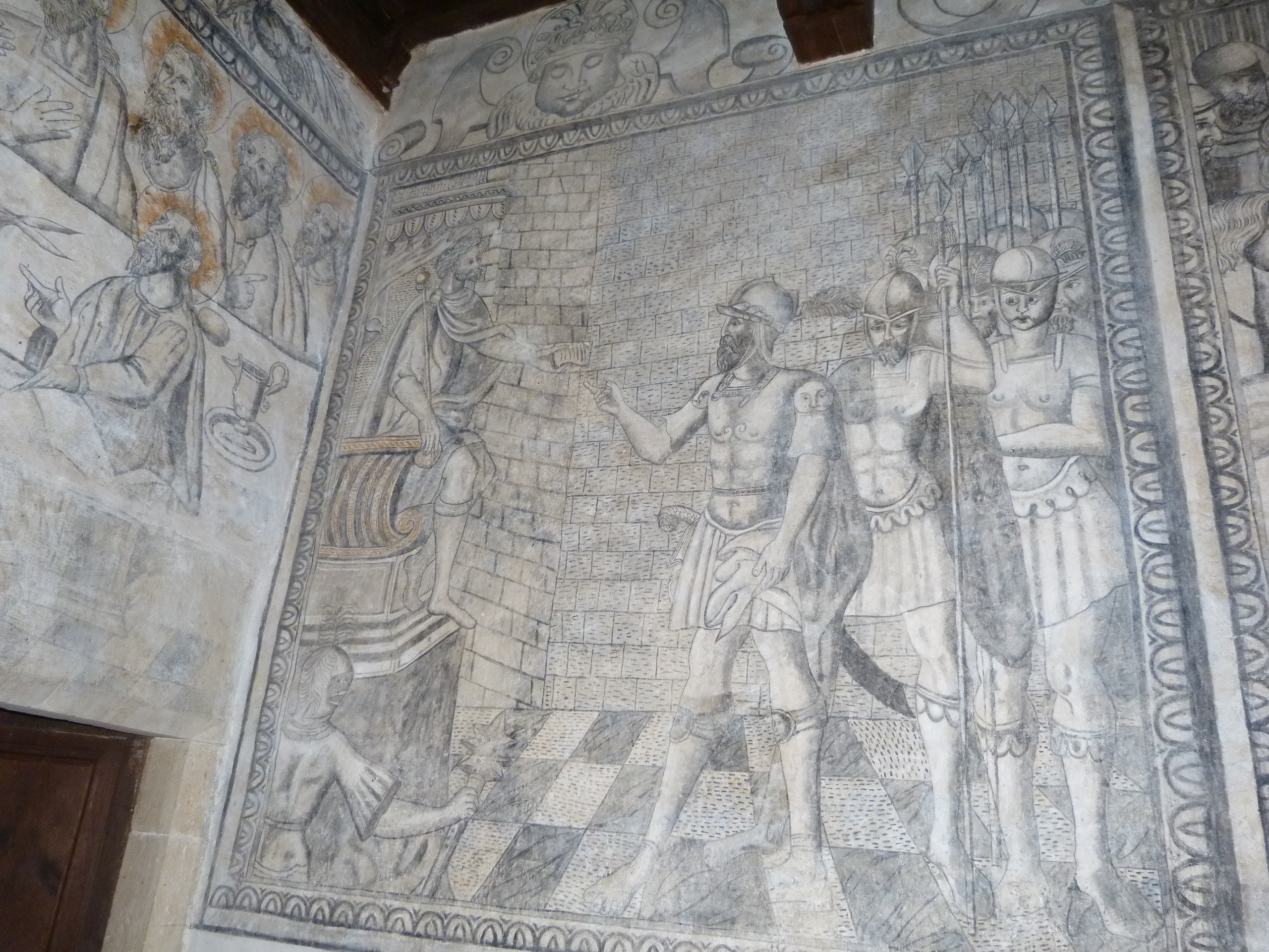 Las principales grisallas las encontramos en la Sala de Reuniones, decorada con pinturas murales anónimas del siglo XVIII, que intentan imitar a tapices. Se representan la Santa Cena, escenas de la vida de San Pablo (su conversión, bautismo, martirio…) y algunos otros temas complementarios, alegorías, personajes en trajes de época y distintos motivos ornamentales.