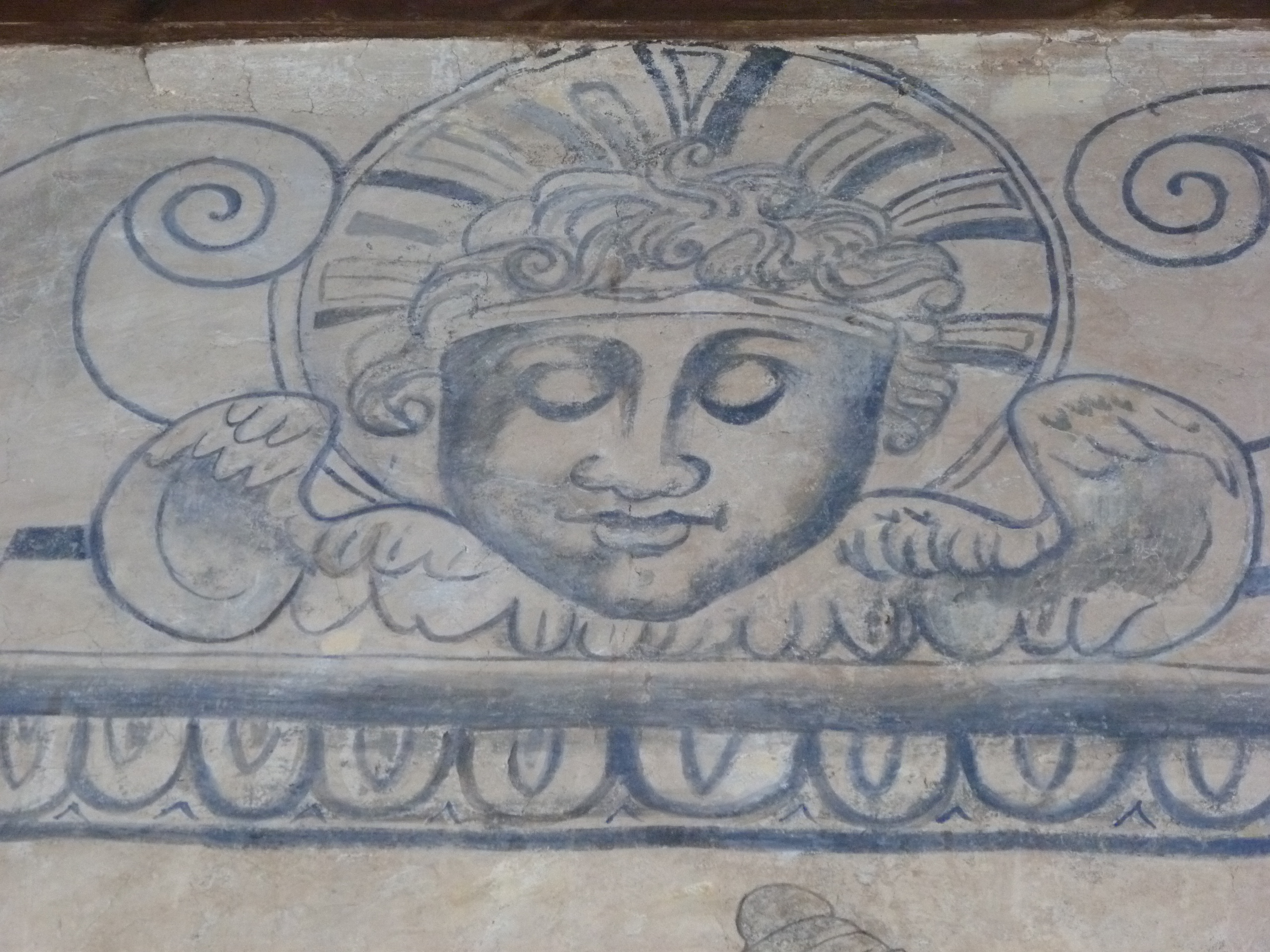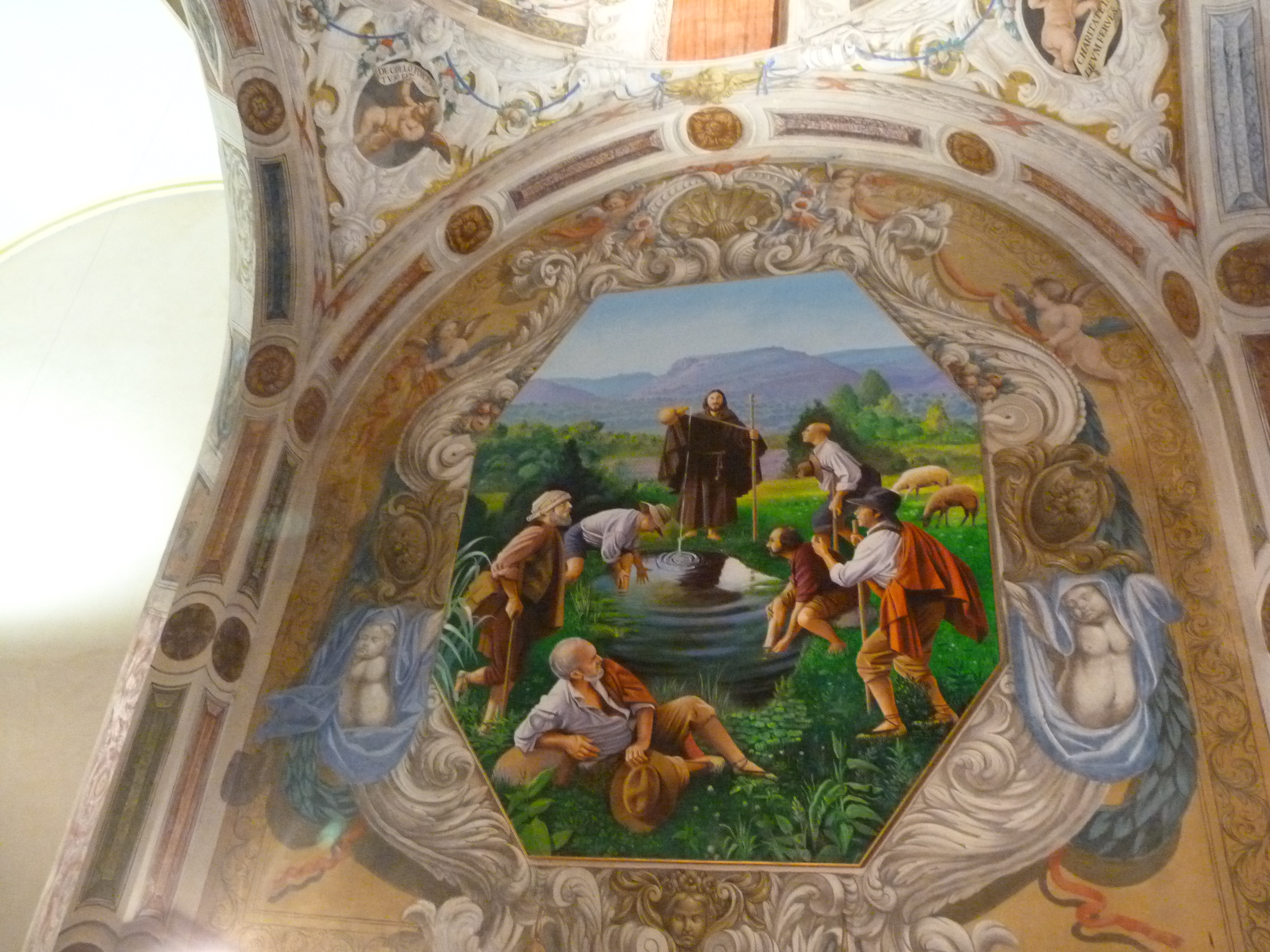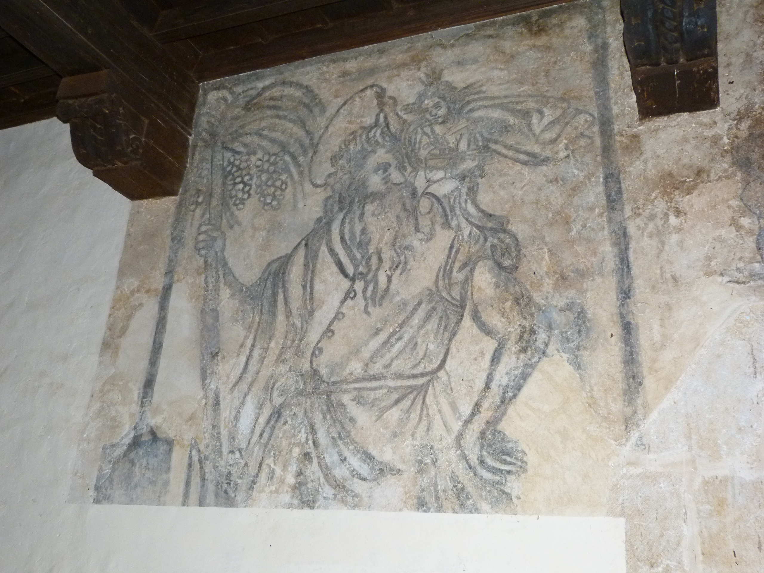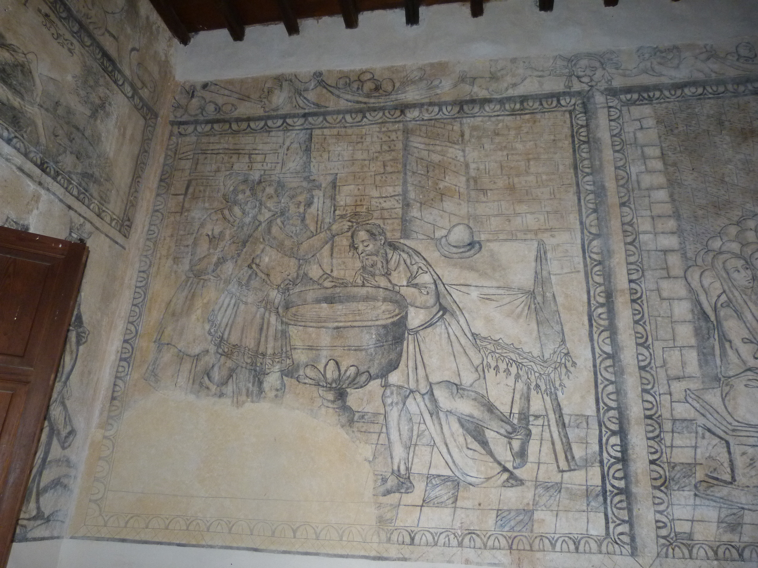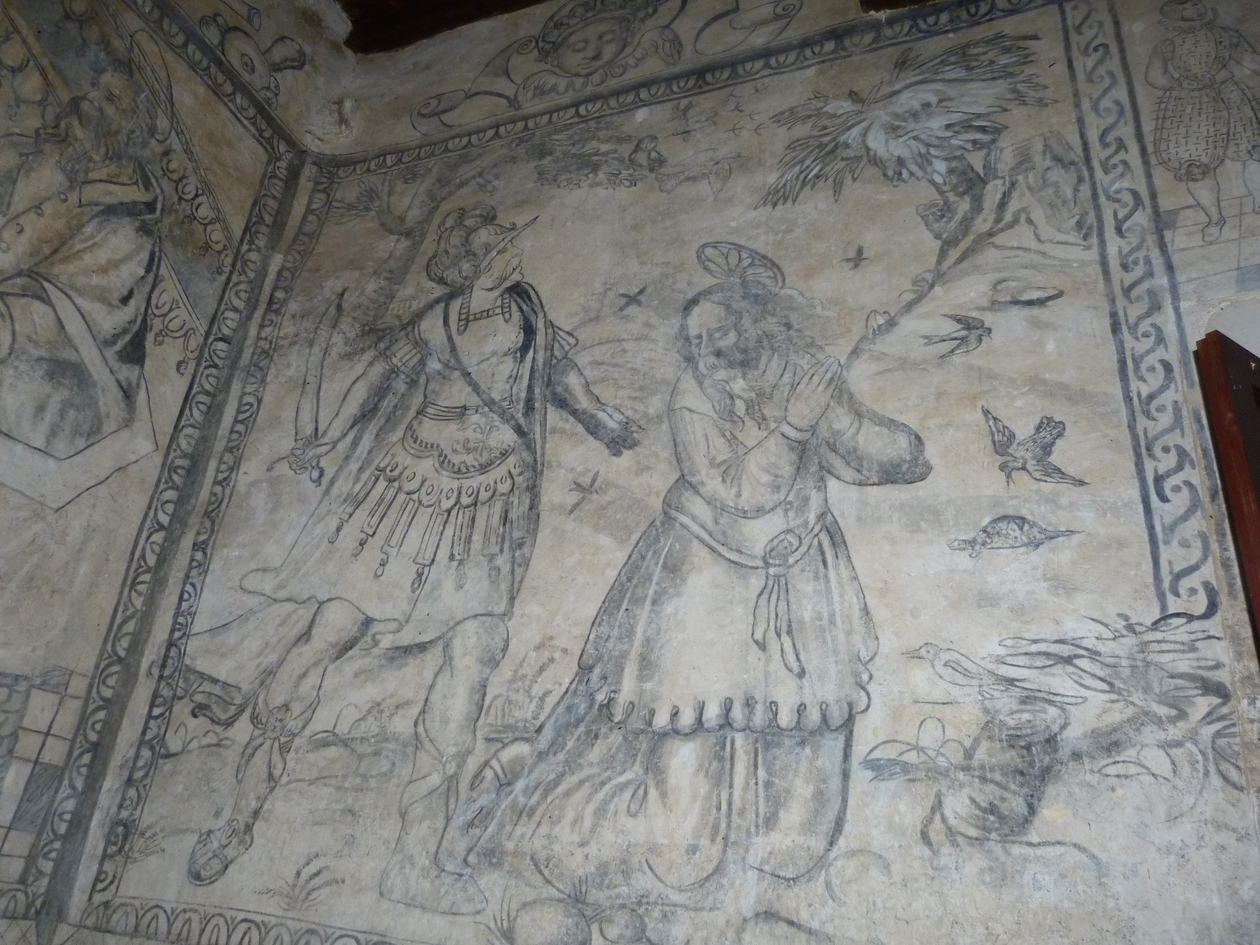 Dentro de la Hospedería encontramos un curiosísimo conjunto de pinturas murales de este tipo que son las autenticas protagonistas de todo el Ermitorio, y que se asemejan en parte a las no tan lejanas grisallas del Ermitorio de la Virgen de Les Fonts en Castellfort, también en el Maestrazgo Castellonense.