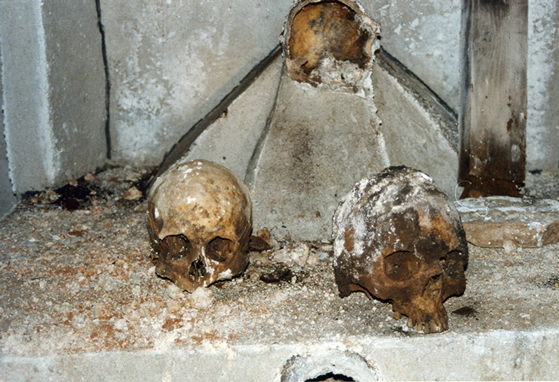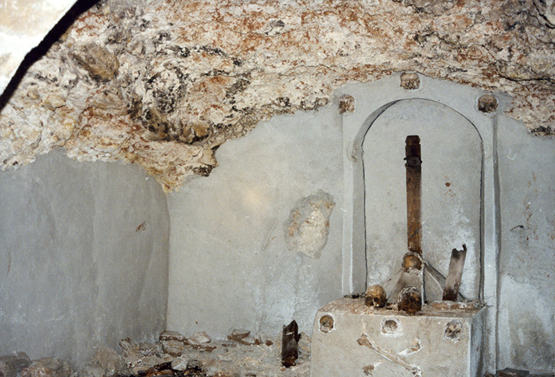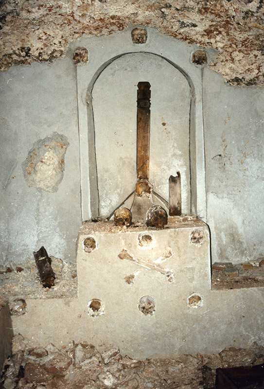 Lo increíble viene después: me relatan que bajo la cabecera de la iglesia existe una cripta con un altar fabricado con cráneos humanos gigantes, muertos desperdigados por el suelo, una horca y paredes con antiguos escritos en latín. En fin… se pueden imaginar mi cara de estupefacción al escuchar aquello. Lo malo para mí es que no podía verlo ni demostrarlo, pues al parecer estaba tabicado desde hace mucho tiempo, y era imposible acceder a ello. Por aquel entonces estaba escribiendo el libro Guía Mágica. La Mesa de Ocaña (Marañón, 2013), decidí no incluir este relato por inverosímil y miedo a ser tachado de amarillista. En el libro comenté que se trataba de un osario (como indica el nombre de la calle anexa a la iglesia) y poco más.