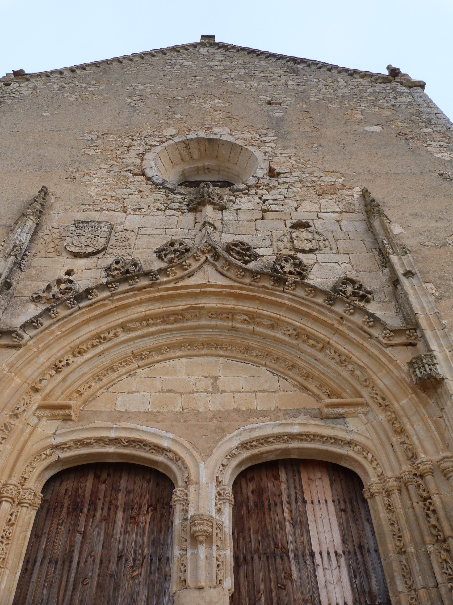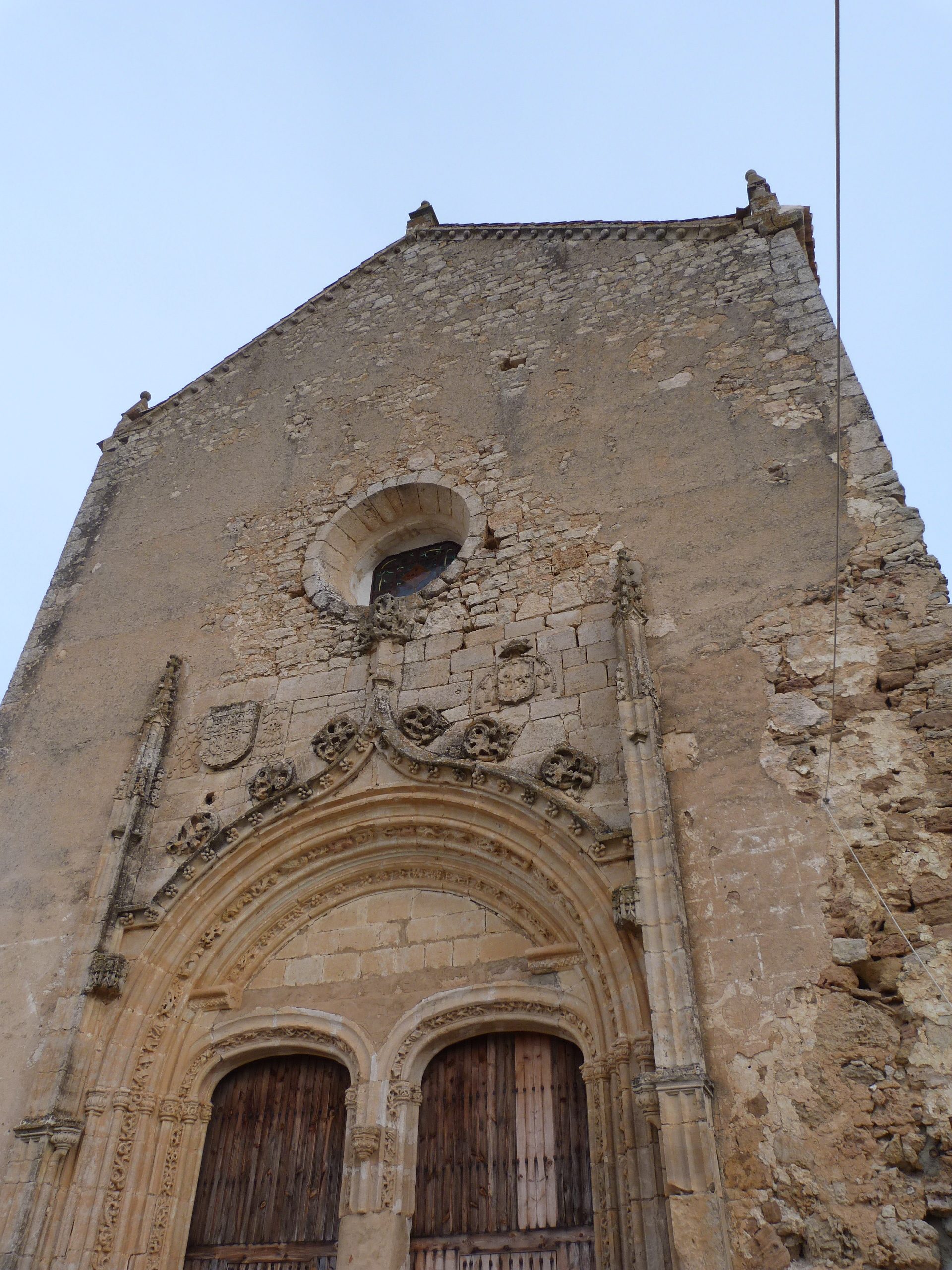 El exterior, con paramentos lisos de mampostería, posee una magnífica portada gótico isabelina abocinada, compuesta por arco de medio punto y dos puertas de entrada con arcos carpaneles y parteluz.