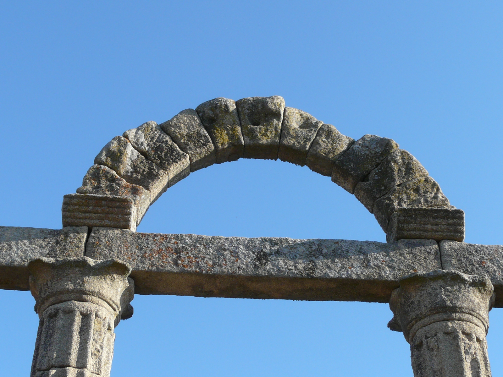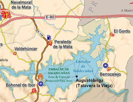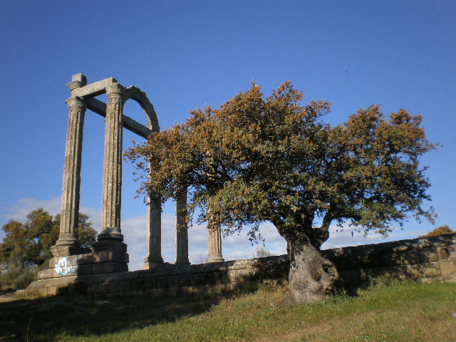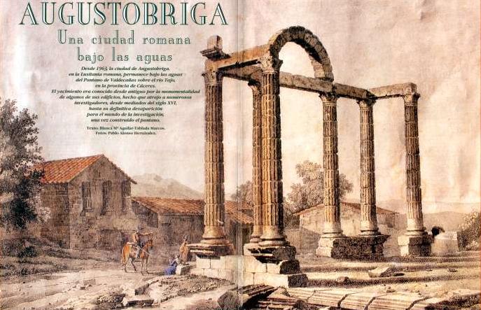 Todos los que alguna vez hemos viajado a Guadalupe desde Navalmoral de la Mata, al cruzar el inmenso mar del Pantano de Valdecañas, hemos dirigido nuestra mirada hacia unas columnas que a modo de templo quedan a la izquierda de la carretera sobre un montículo, y donde numerosos curiosos paran a hacerse la foto de rigor, estos restos son los único que queda de la antaño importante e incipiente Augustobriga, cruce de caminos y comerciantes y que hoy queda bajo las aguas del pantano que le rodea. Restos víctima del desarrollismo de la época de la Dictadura, a la que tan poquito importaba el Patrimonio. Solo el Pórtico que observamos hoy atestigua lo queda bajo las aguas.