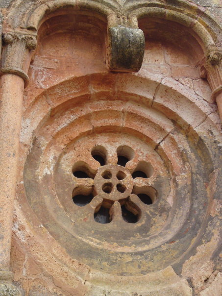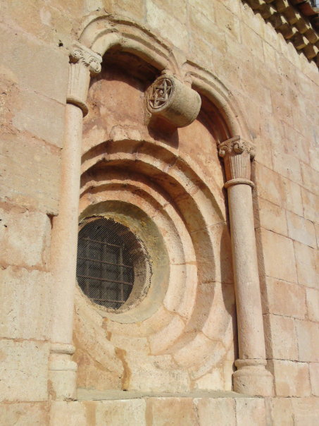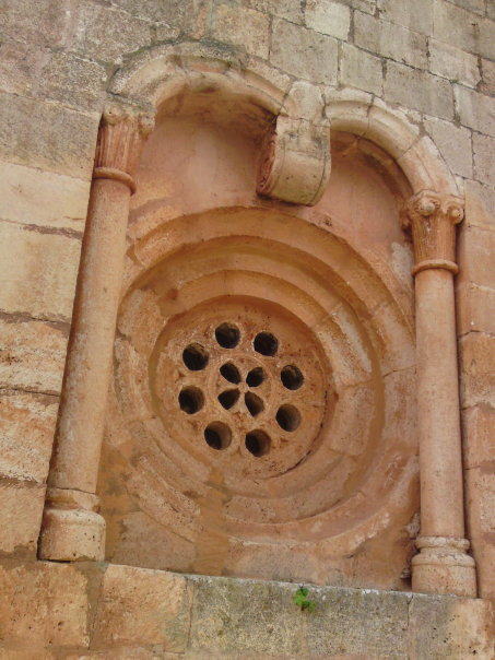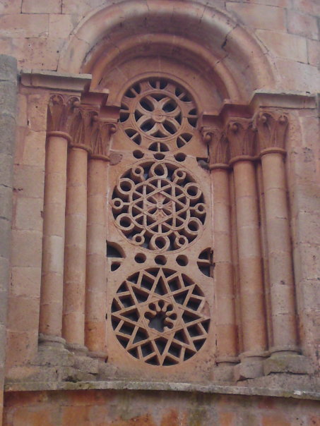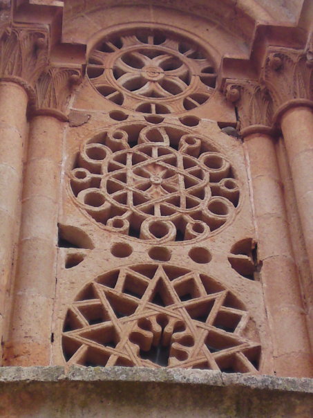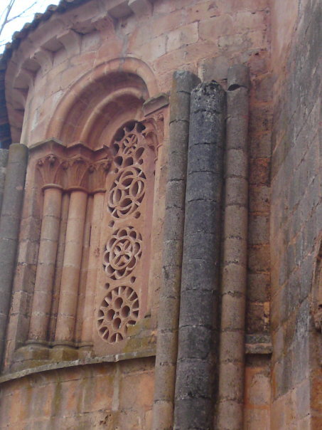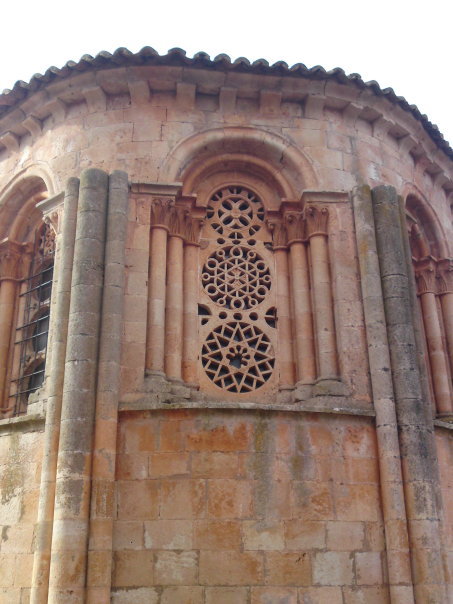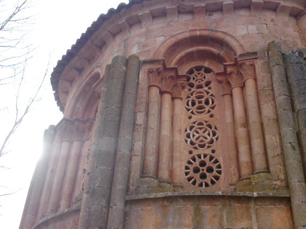 Cada vano está formado por celosías orientalizantes con variedad de trazados a base de estrellas, triángulos, círculos secantes, combinados de tal manera que dan como resultado un conjunto de figuras geométricas. Varias de ellas parecen ser cruces de Malta, lo que apoyaría la hipótesis de la intervención de la Orden de San Juan de Jerusalén o que el Arquitecto tuviera relación con ellos. Los ábsides laterales muestran muro plano y una extraña y original ventana cada uno, que coincide en sus formas con otra que se abre en el muro presbiterial del absidiolo de la Epístola. Su forma es de arco ajimezado, pero en lugar de columna central o parteluz, los arquillos laterales abocelados coinciden en un pinjante que lleva tallado en sus caras el sello de Salomón,este sello tambien aparece en la cercana Iglesia de Campisabalos, a la cual ya dedicamos una entrada hace tiempo hablando de su famoso “Calendario Agricola”.