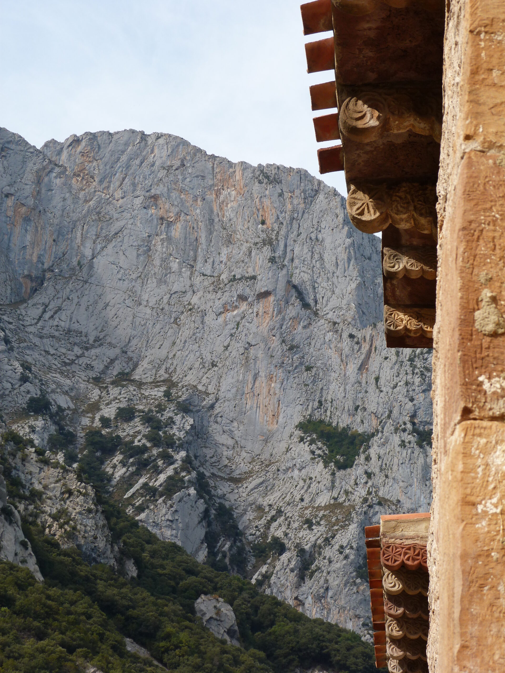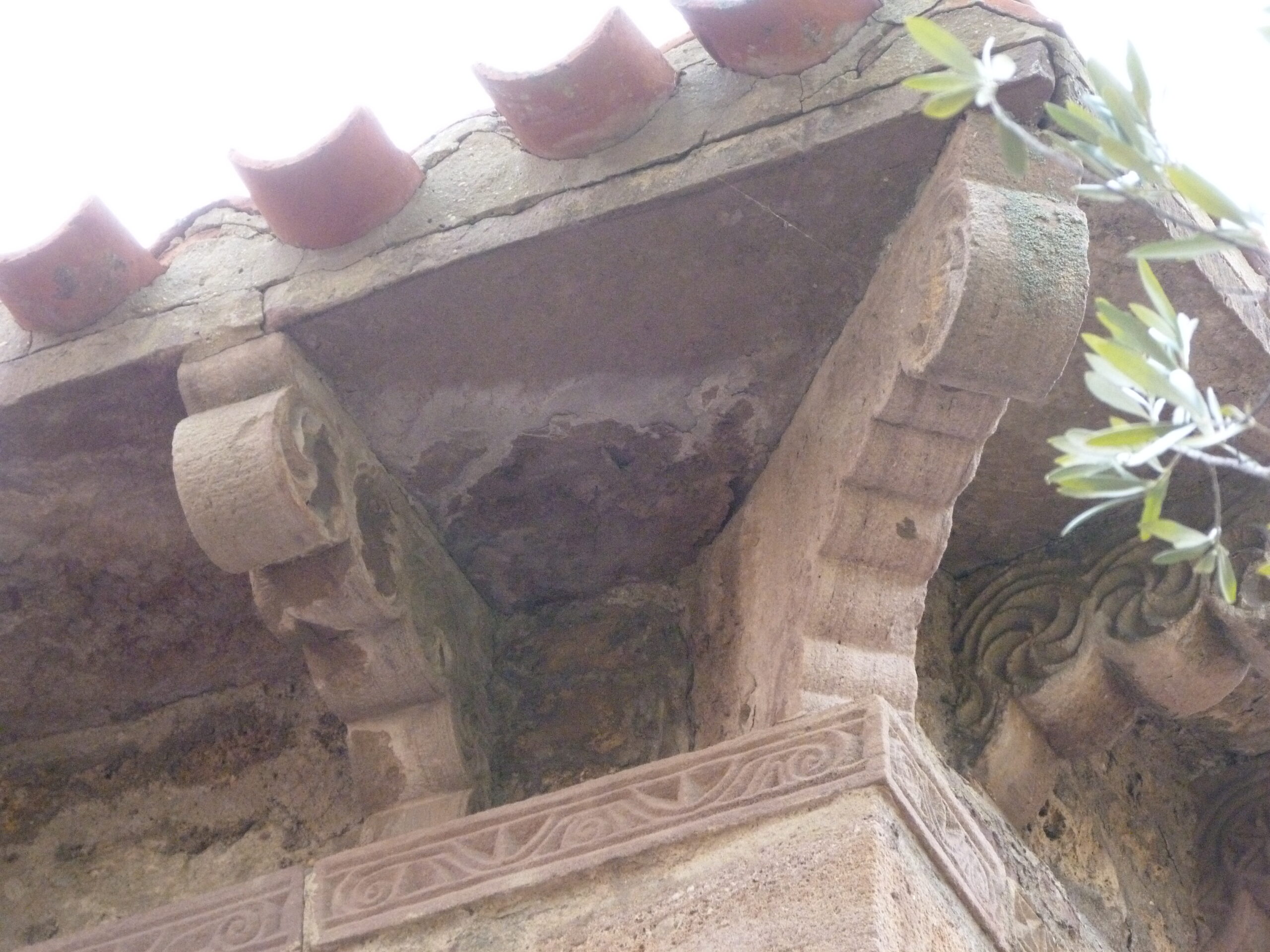 Estas cubiertas forman aleros muy pronunciados que apoyan en modillones de lóbulos y rollos. decorados con esvásticas y rosetas inscritas en círculos. Por debajo corre una cenefa decorativa a base de tallos, zarcillos y otras figuras vegetales, típicas del Arte Mozárabe.