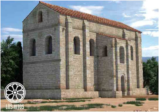 Reconstrucción ideal del Monasterio de los Hitos, que se asemeja bastante en su estructura con la Ovetense Santa Maria del Naranco. Fuente: http://www.villadeorgaz.es/